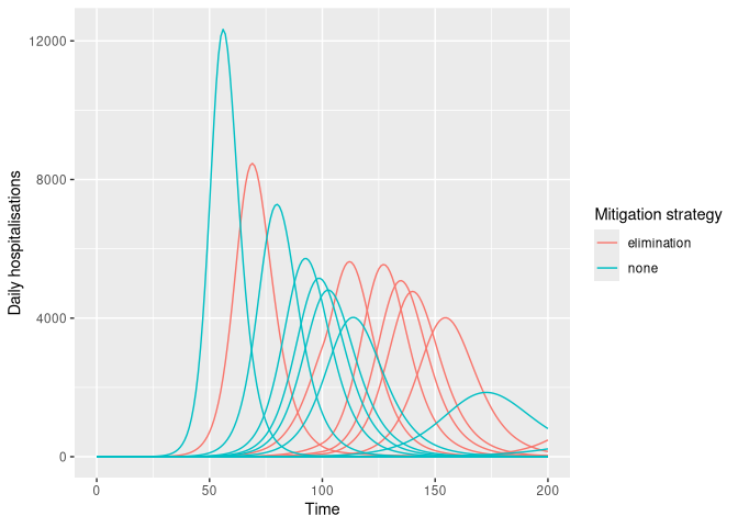 This example shows how to model multiple pandemic response scenarios in the U.K. with uncertainty in \(R_0\) of an H1N1-like infection. Note that daedalus.compare only supports running daedalus::daedalus_multi_infection() using daedalus.compare::run_scenarios() at present.