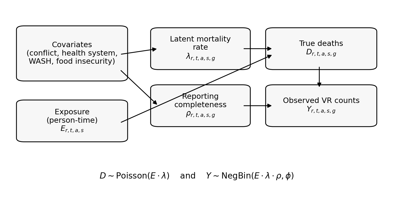 - The arrow from covariates to represents the mortality submodel, for example a positive effect of conflict on trauma mortality.